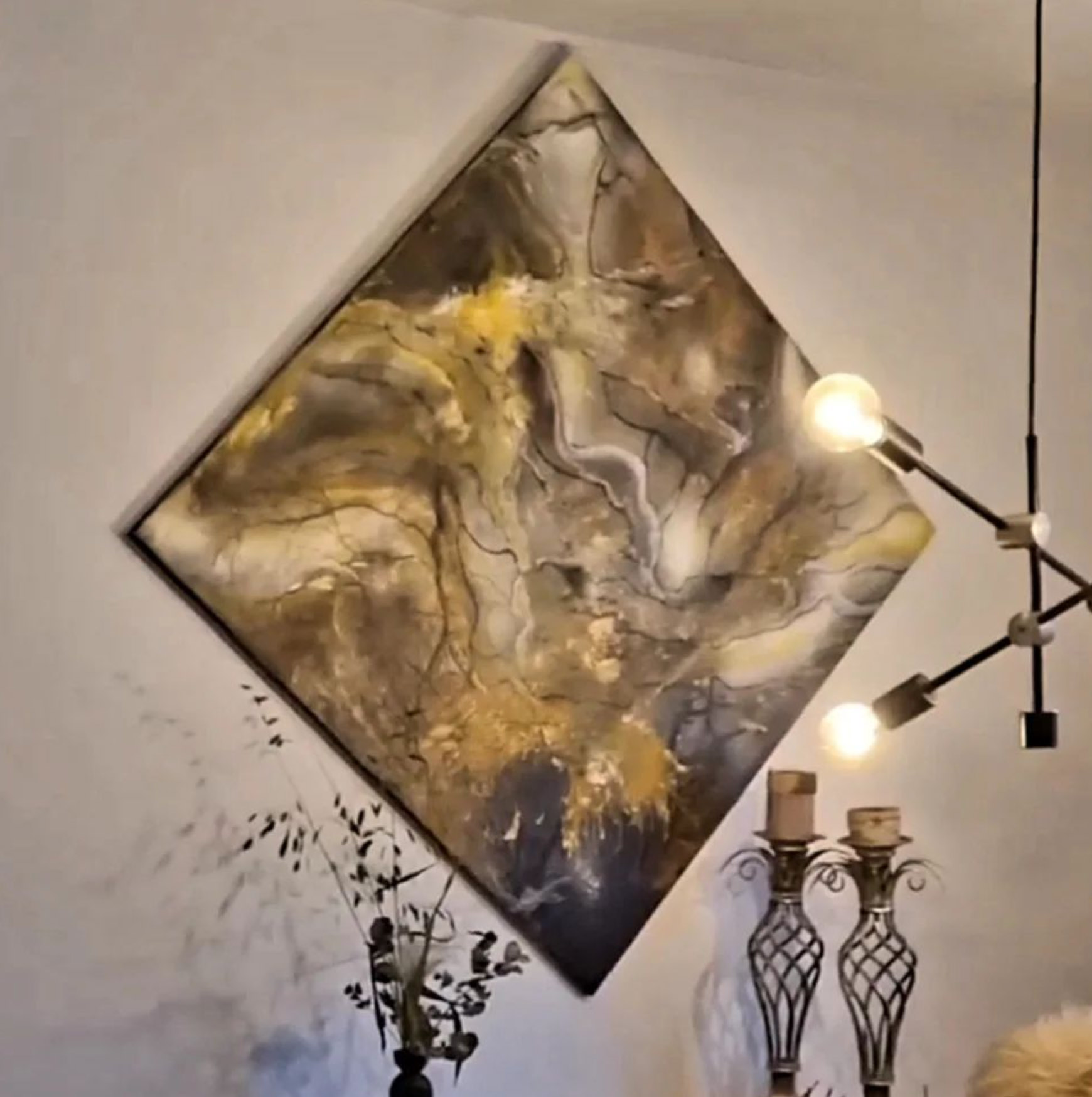 "In order to shine- Keep the light on" er et værk der vibrerer mellem lys og mørke. Gyldne stråler og sprækker bryder frem gennem dybere jordnærer nuancer.