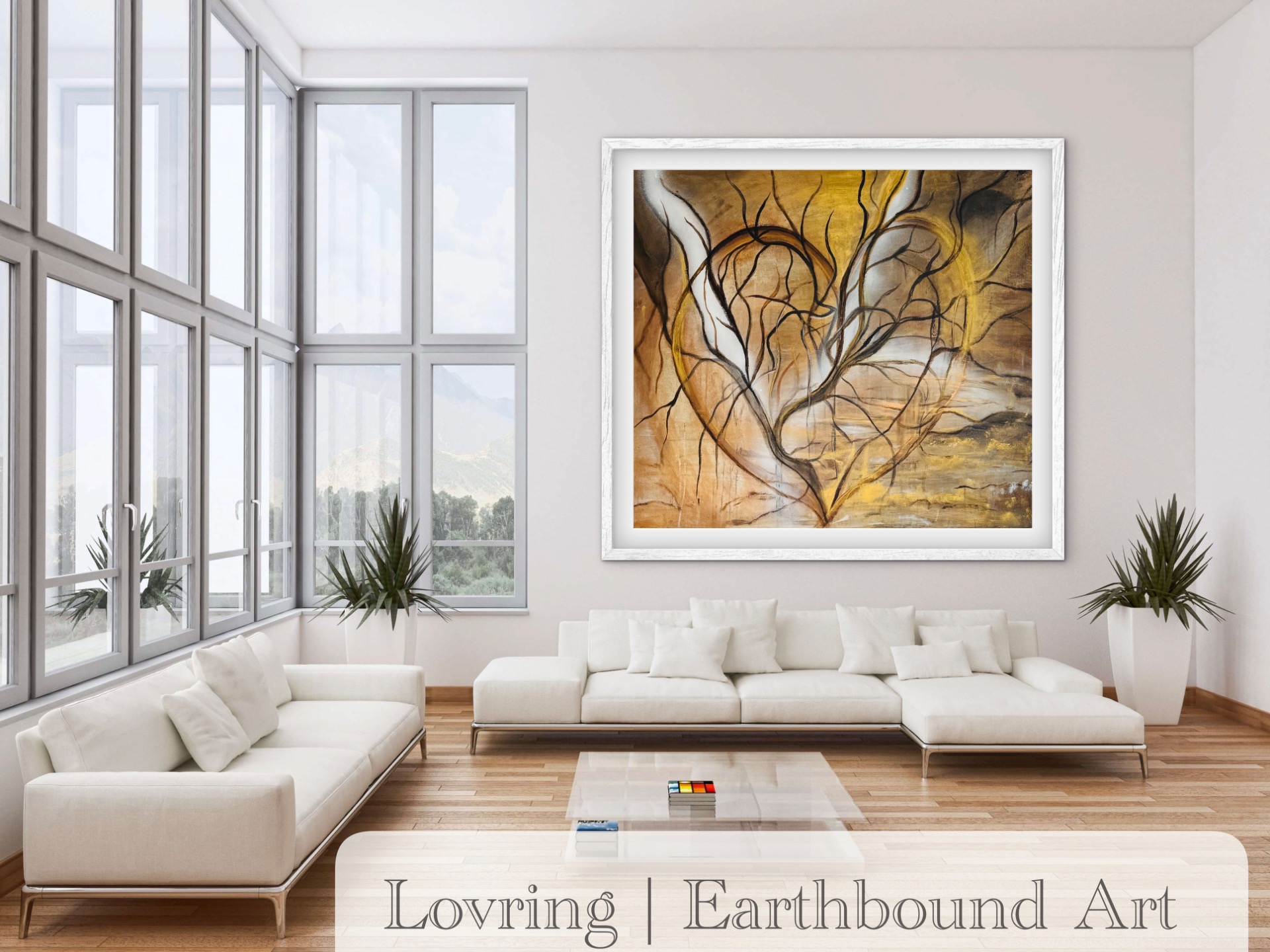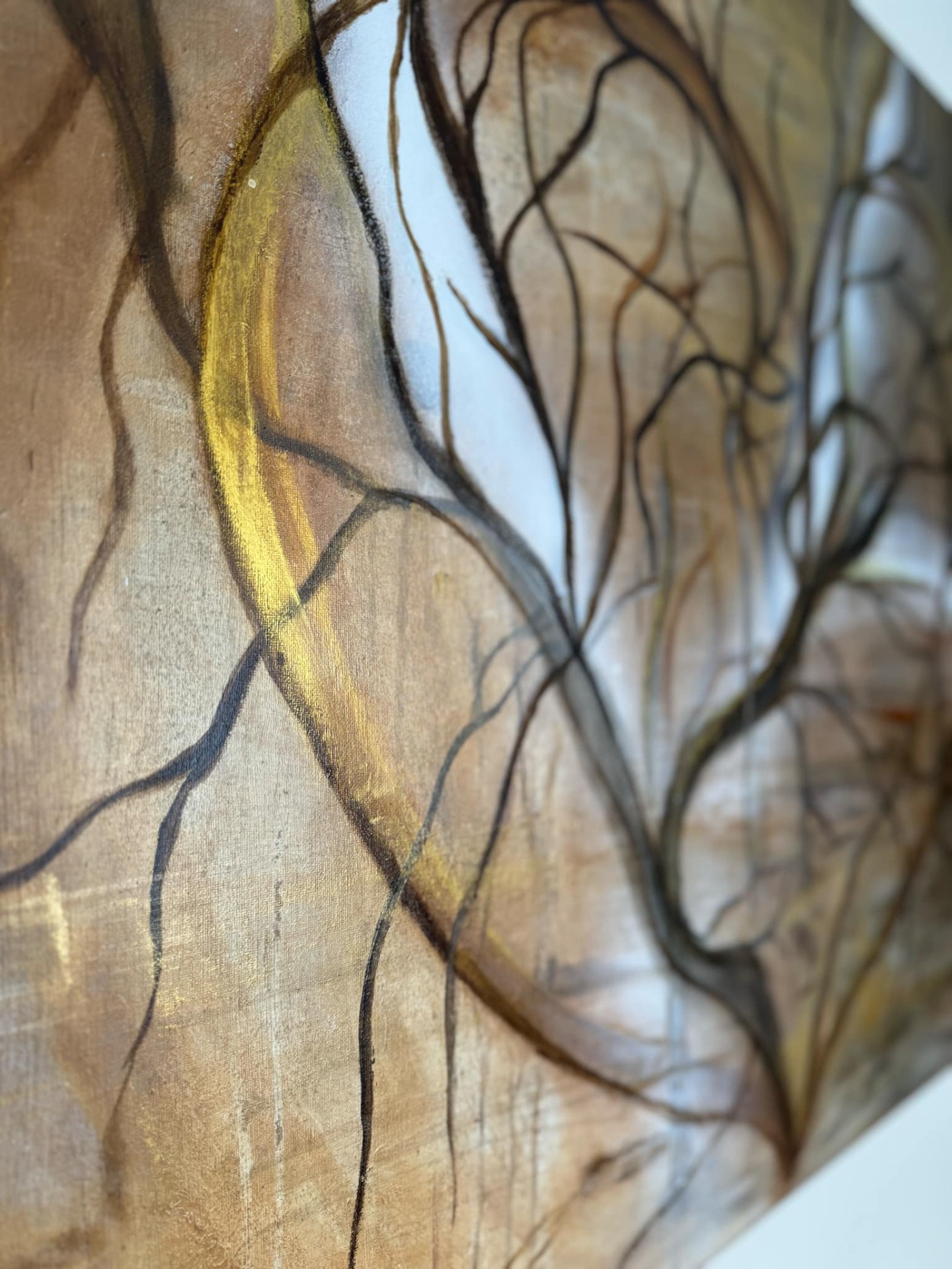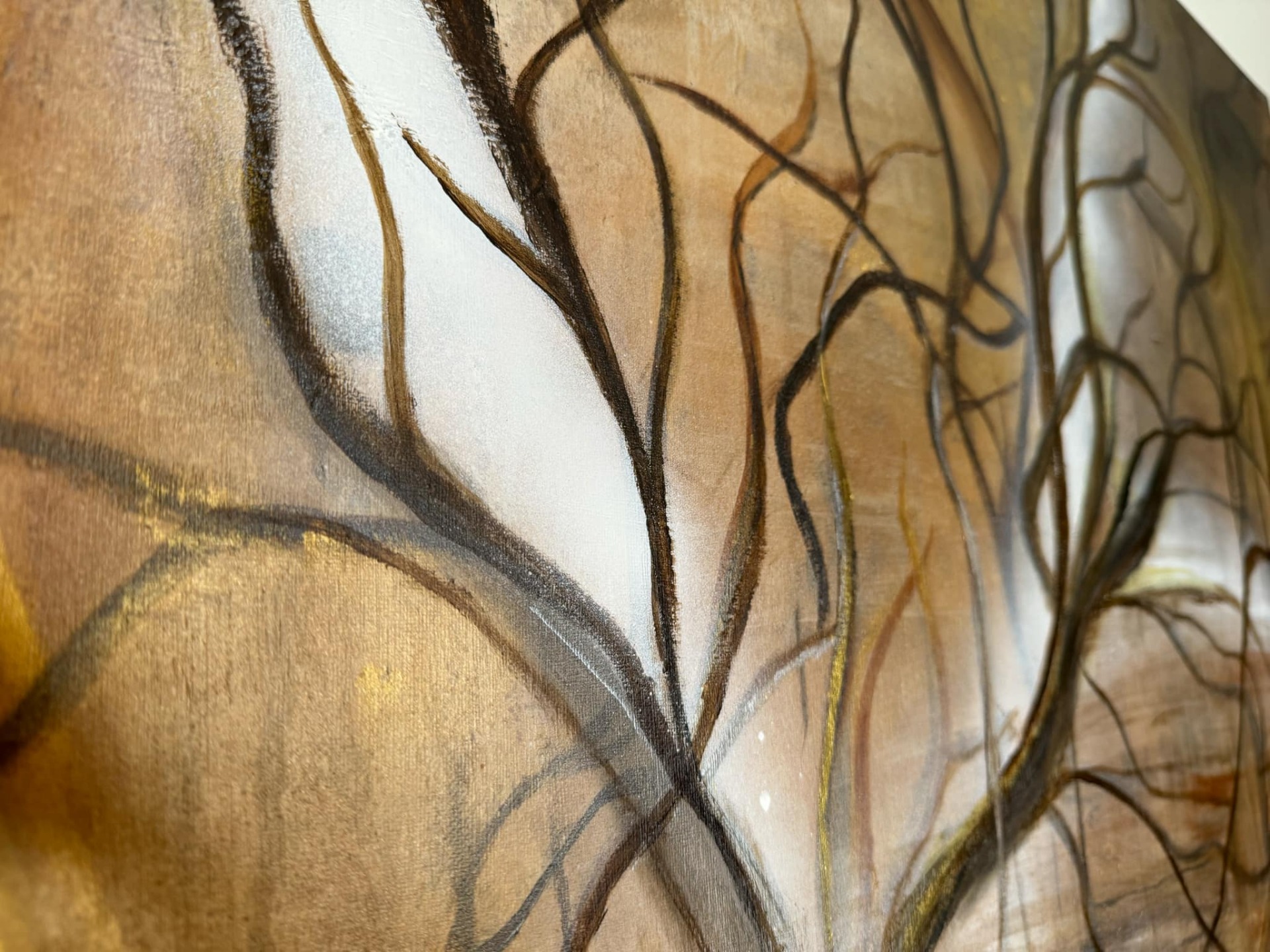 De varme jordfarver, blandet med gyldne glimt, giver en følelse af liv, vækst og forankring, mens de hvide strøg, tilfører åbenhed og balance.