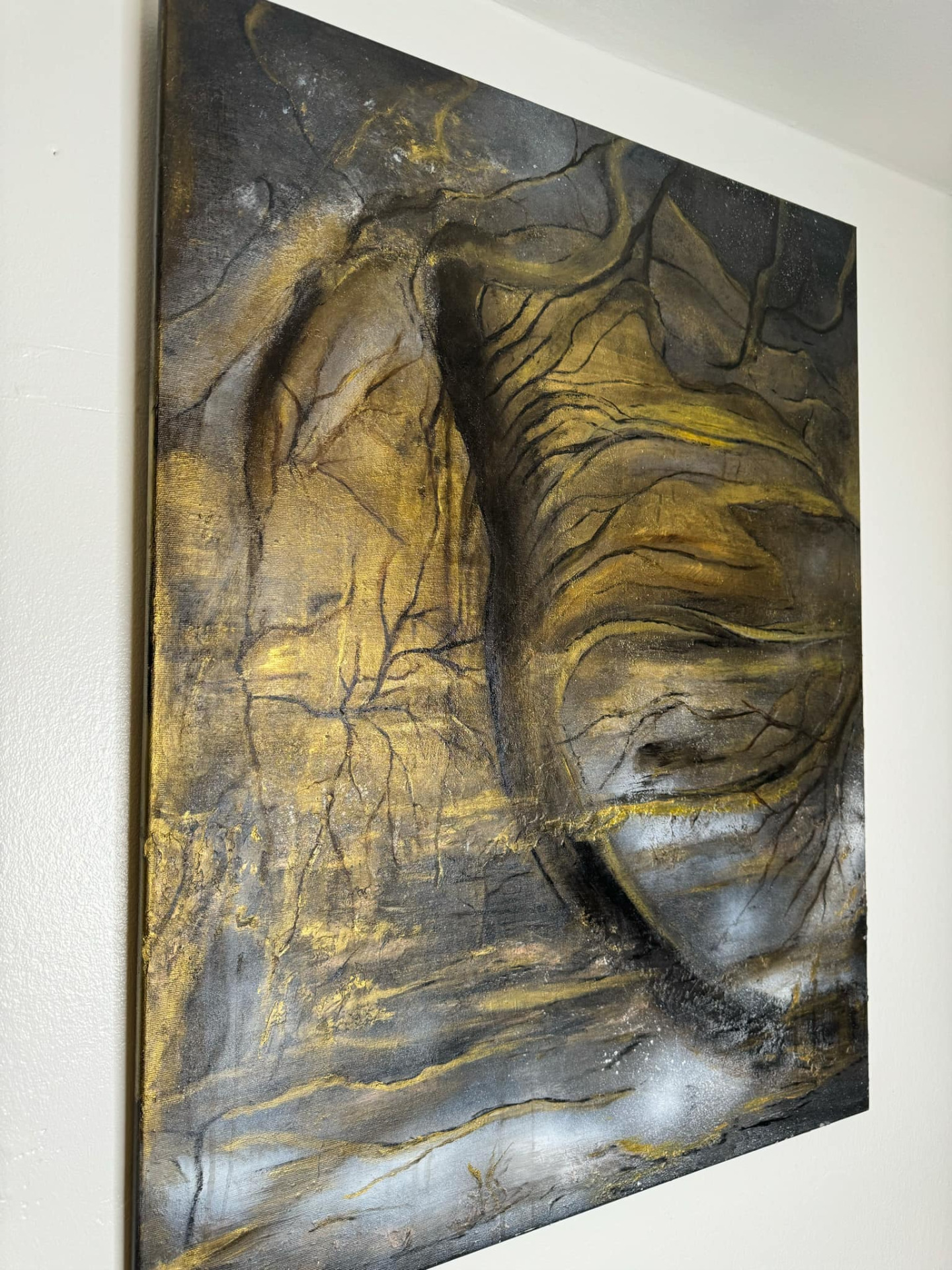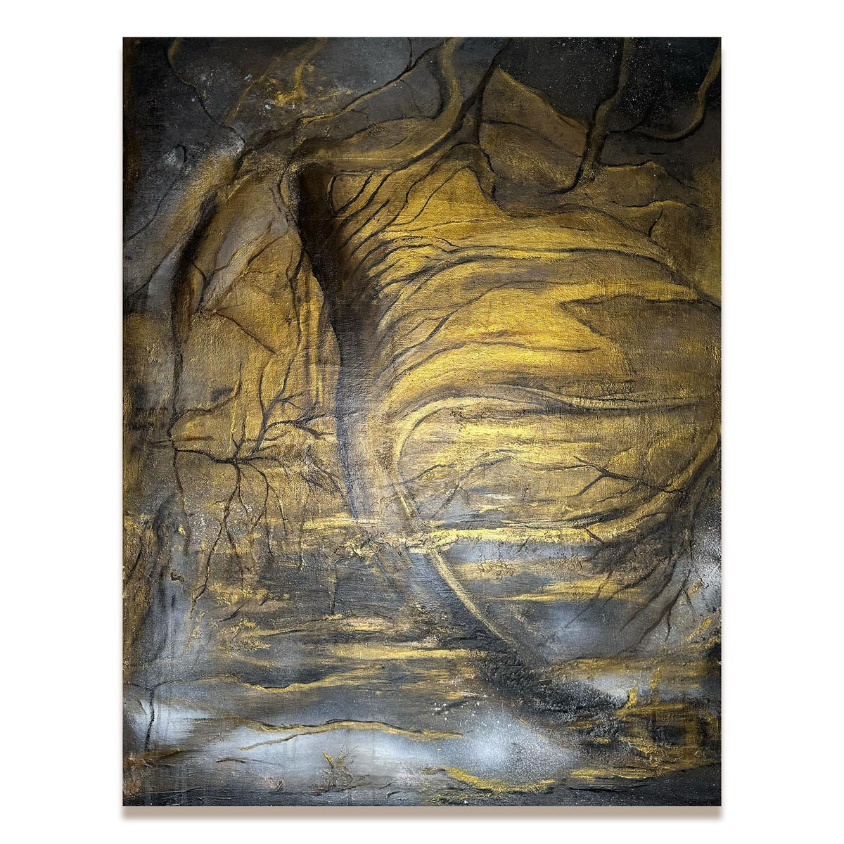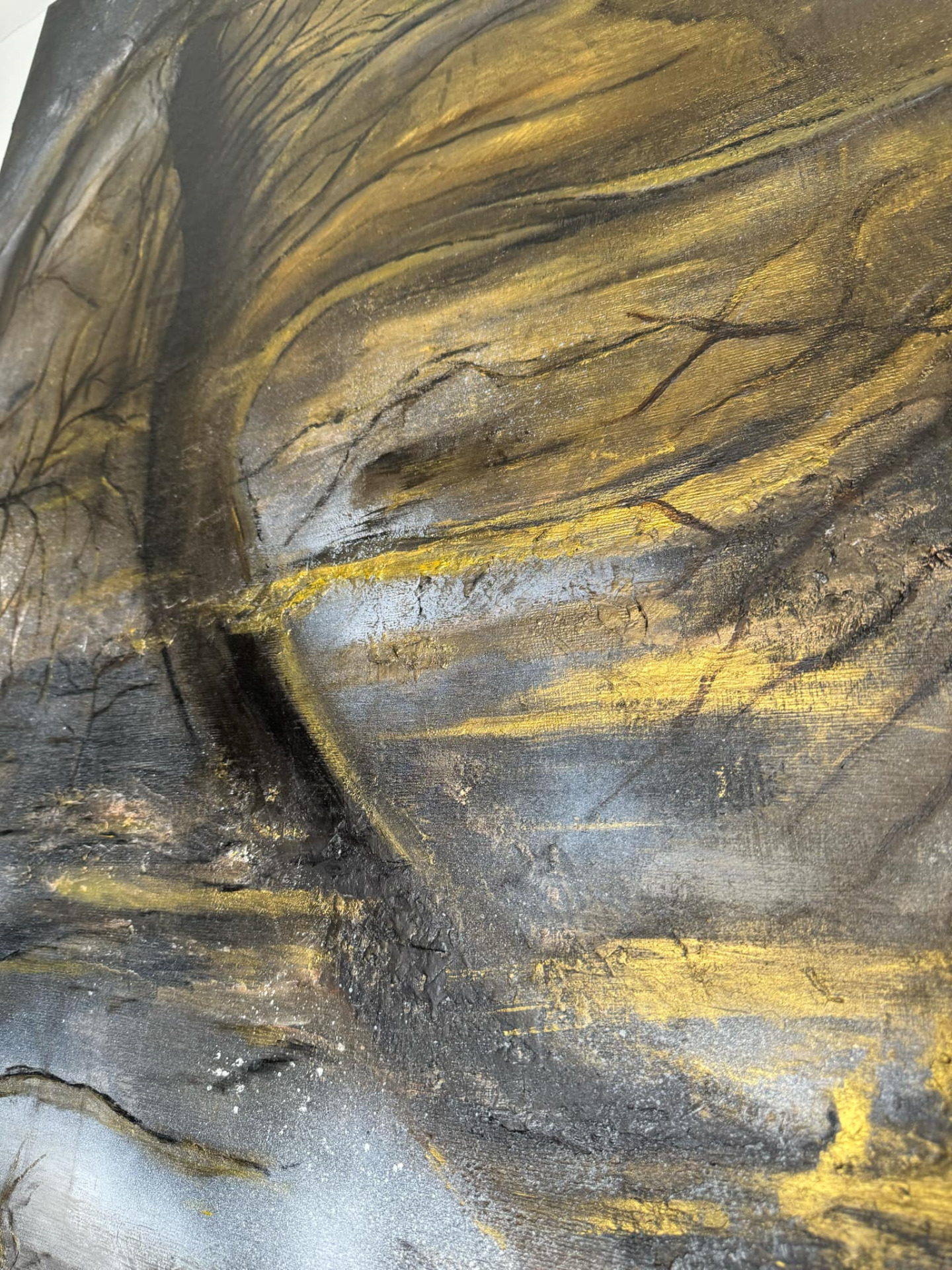 De gyldne strøg synes at gløde indefra, som et vidnesbyrd om den styrke og vitalitet, der findes i det skjulte.